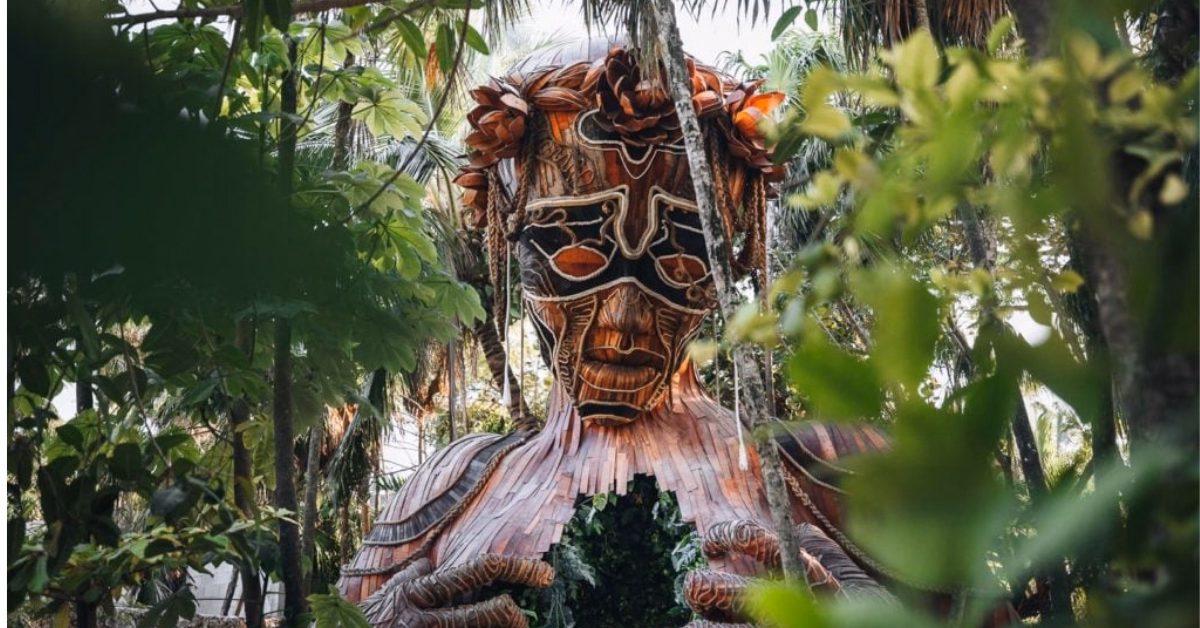 The Ven a la Luz statue by artist Daniel Popper is one of Tulum’s most recognizable landmarks. This towering wooden and rope sculpture, depicting a figure opening its chest to reveal a lush jungle interior, symbolizes the connection between humans and nature. Originally unveiled during the first Art With Me festival, the statue has since been relocated and is now housed inside the Ahau Tulum Art Park.