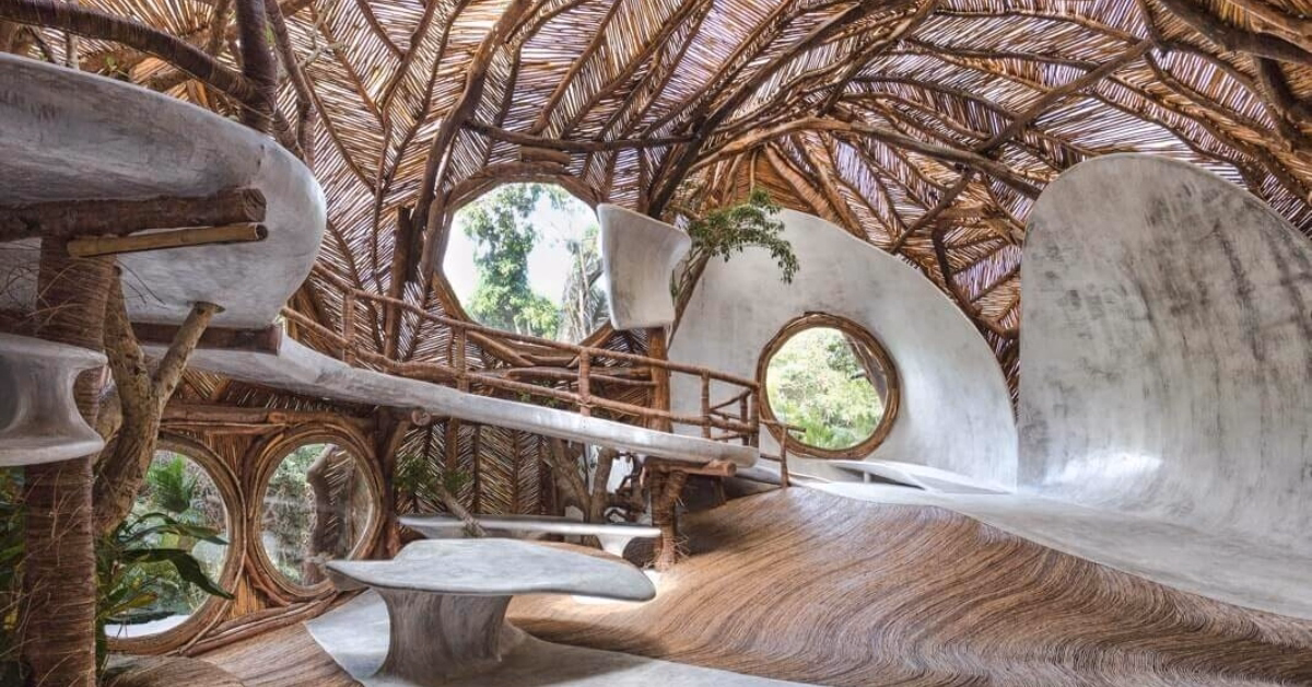 But this is no ordinary gallery. Built without industrial tools, without right angles, and without synthetic materials, the museum itself is an artwork. Walls twist like vines. Rope bridges hang from the ceiling. Wooden walkways curve up into domes. The structure is made from bejuco (a local vine), zacate (thatch), concrete, and locally sourced wood. It’s built on intuition and fluidity, meant to feel like a continuation of the jungle outside.