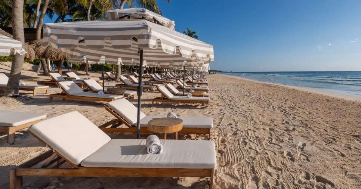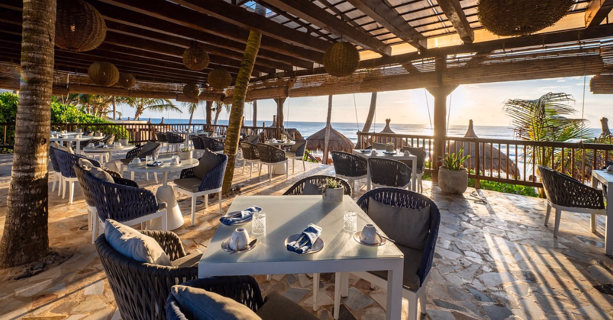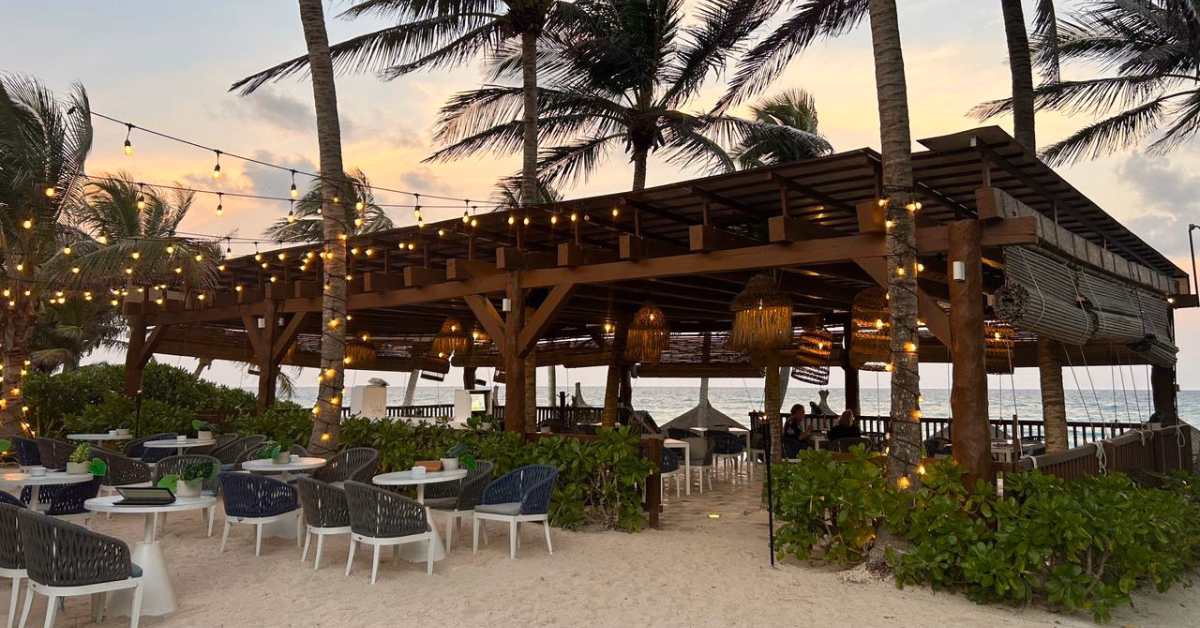 Here, the vibe is calm and refined, not a party setting, but a space to unwind, enjoy the ocean breeze, and slow down. With eco-inspired design, soft sandy floors, and open palapa spaces, everything feels connected to the beach and created for easy, meaningful moments. Throughout the day, you can settle into oceanfront beds, enjoy fresh seasonal dishes, sip cocktails, or explore experiences like romantic candlelit dinners and wine or tequila tastings. Their all-day options make it simple to enjoy the beach at your own pace.