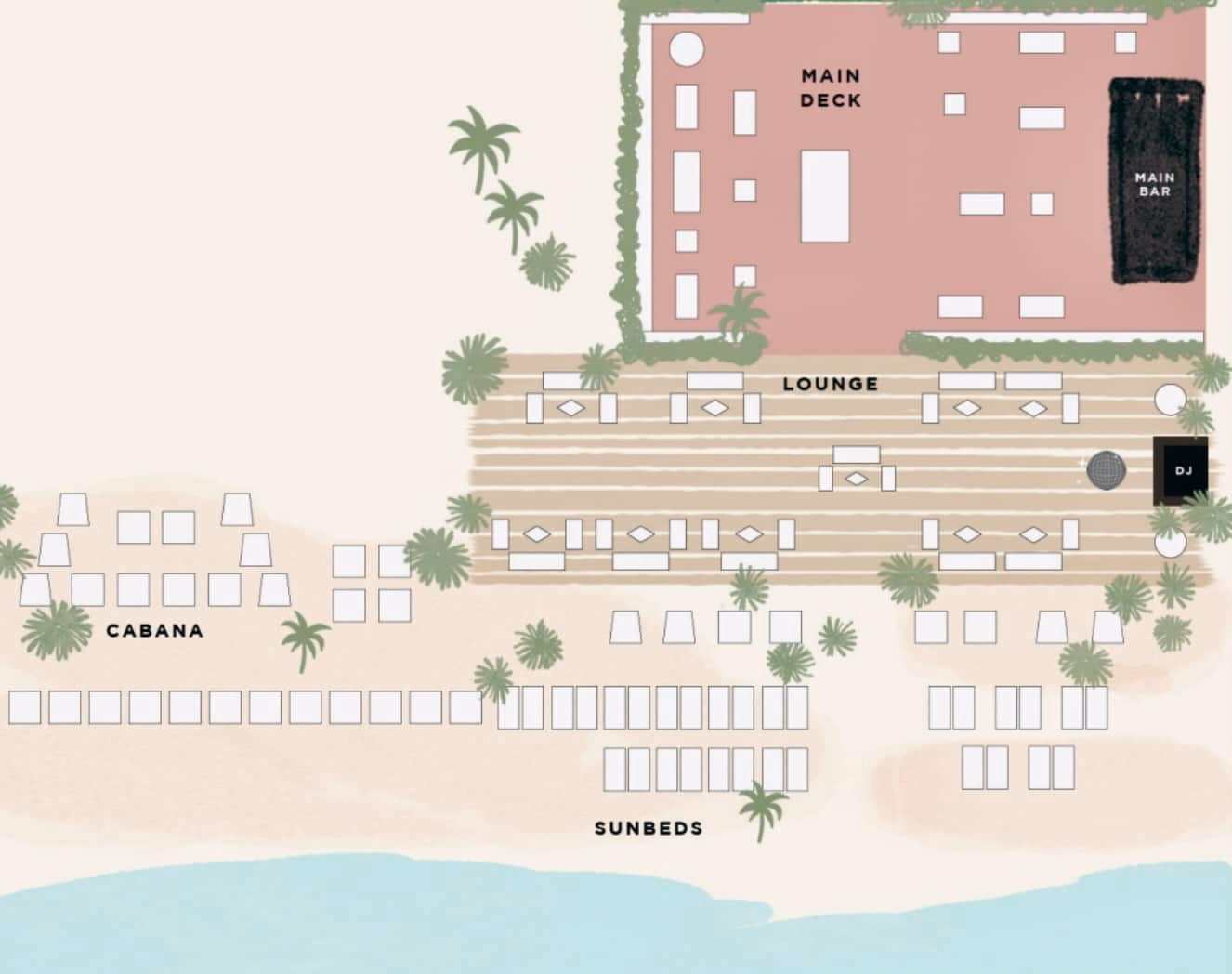 The beach club typically operates from 11:00 AM to sunset, with additional evening hours for special events.