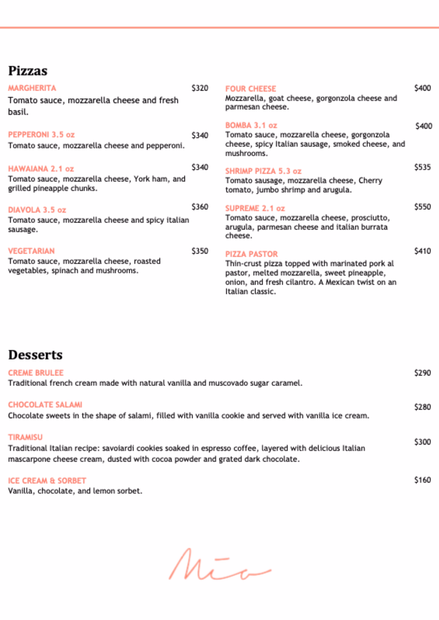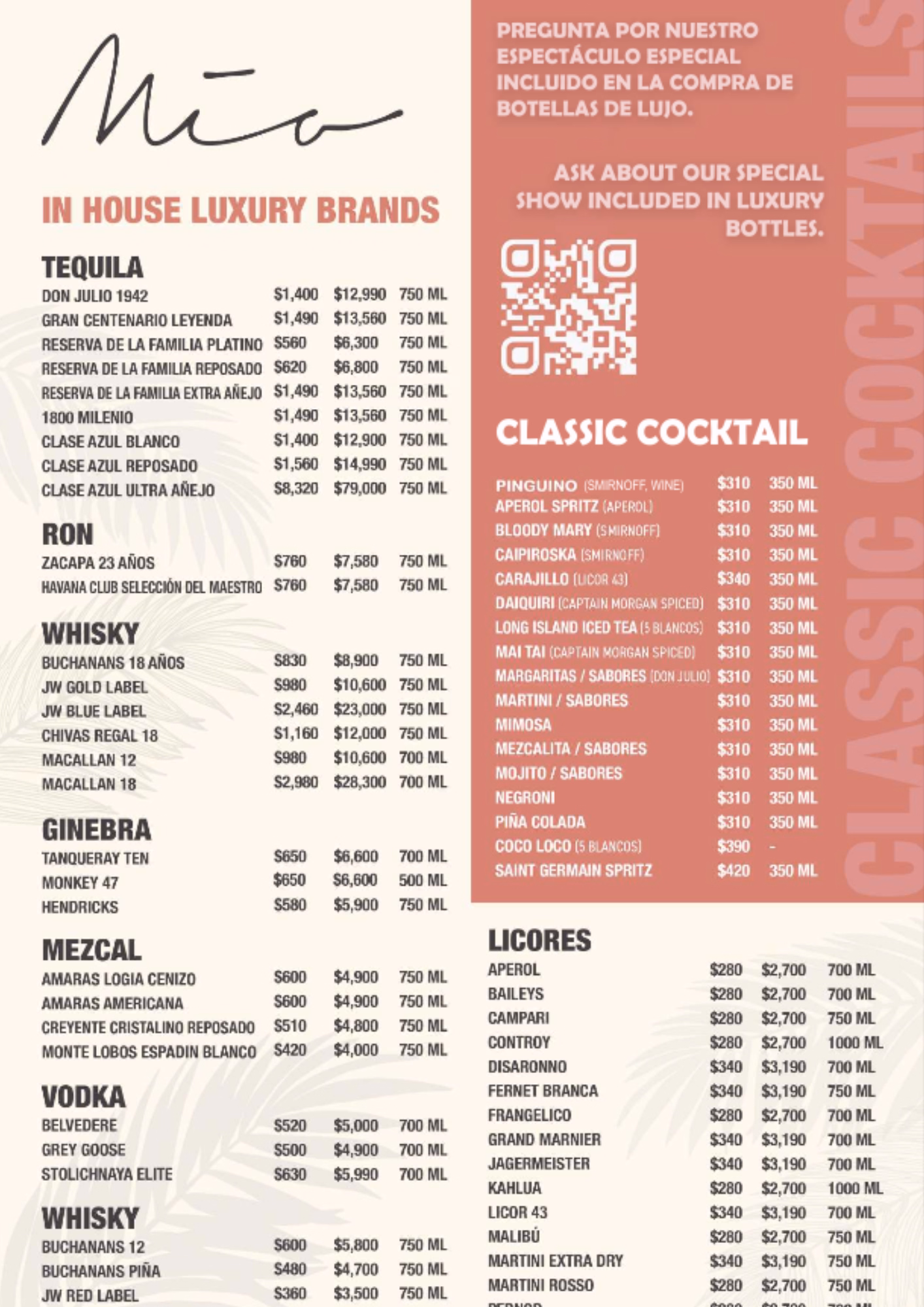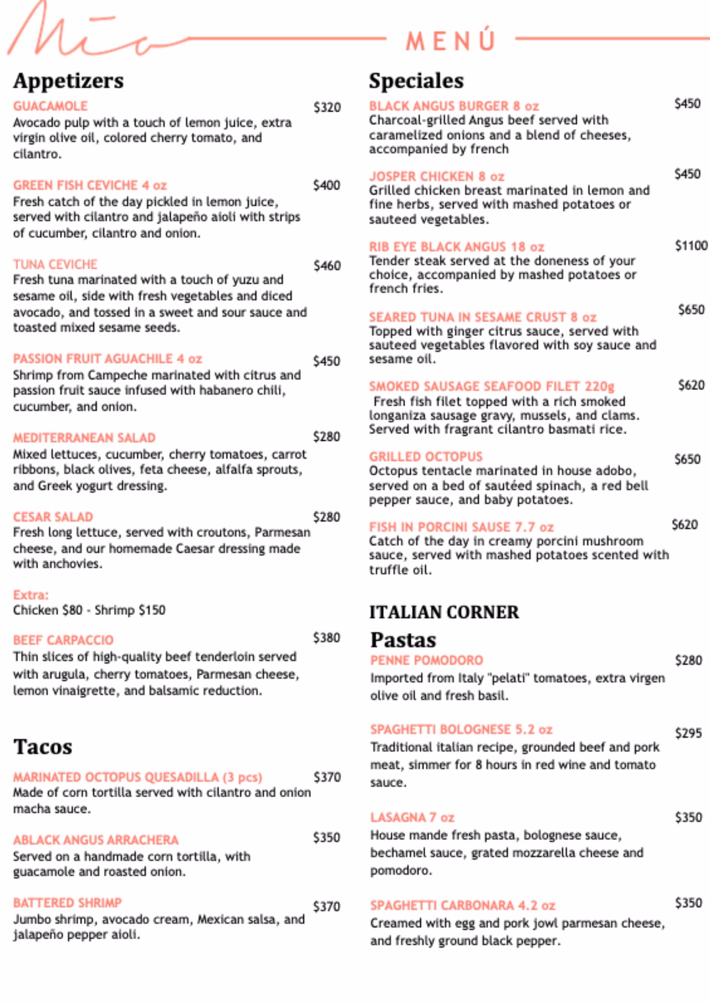 The menu at Mia Beach Club features a vibrant mix of international dishes with a focus on fresh, locally sourced ingredients. Guests can enjoy a variety of options, including fresh seafood, hearty salads, flavorful tacos, and gourmet entrées that cater to diverse palates.