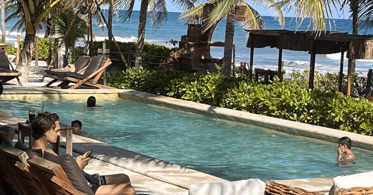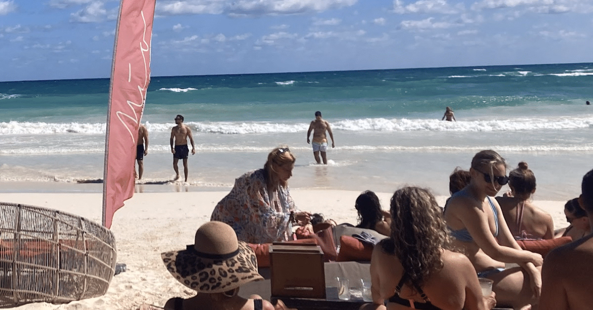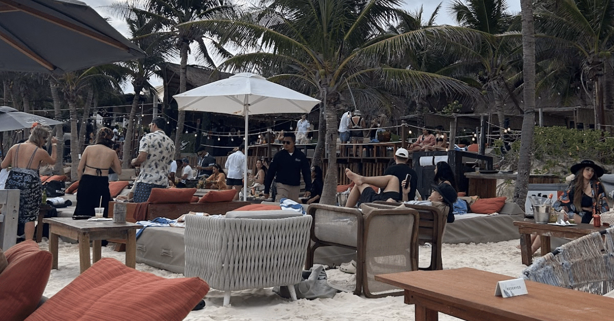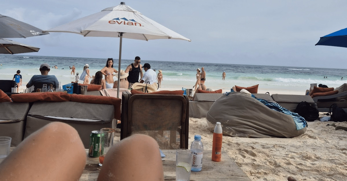 1.300 MXN (~65 USD) minimum spend per person/beachbed for people 12 years or older.