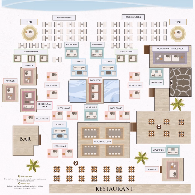- 2.500 MXN (~125 USD) per person/beachbed.