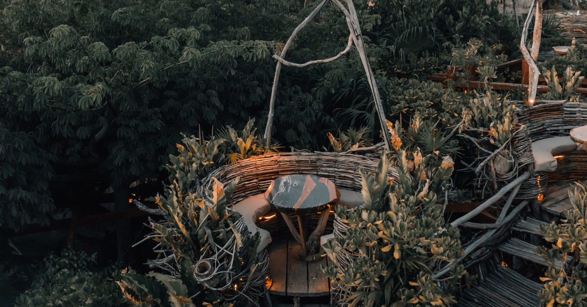 Kanan Rooftop sits above the hotel — nest-style seating built into the structure with 360° views of both the ocean and the jungle canopy.
