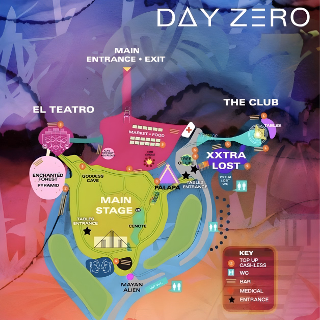 Day Zero operates with an arrival-by-shuttle-only policy. Private vehicles and taxis are not permitted to access the venue directly. Official event shuttles depart from a meeting point located near the Tulum Ruins area, serving as the main access to the festival site.