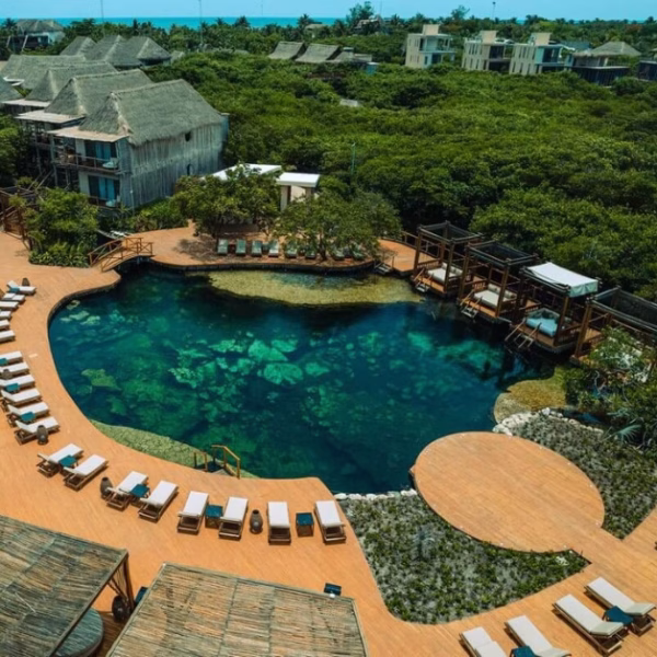 Aerial view of a resort with an irregularly shaped pool reminiscent of cenote clubs, surrounded by lounge chairs and greenery, thatched-roof buildings, and paths. The ocean and more buildings are visible in the background.