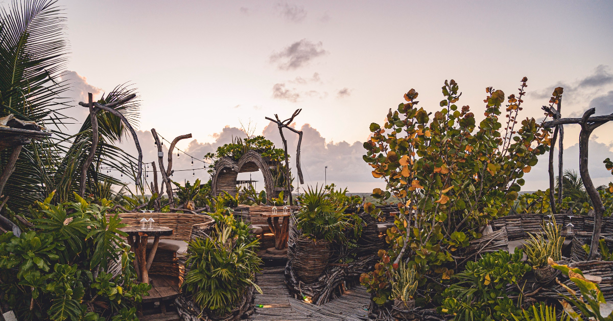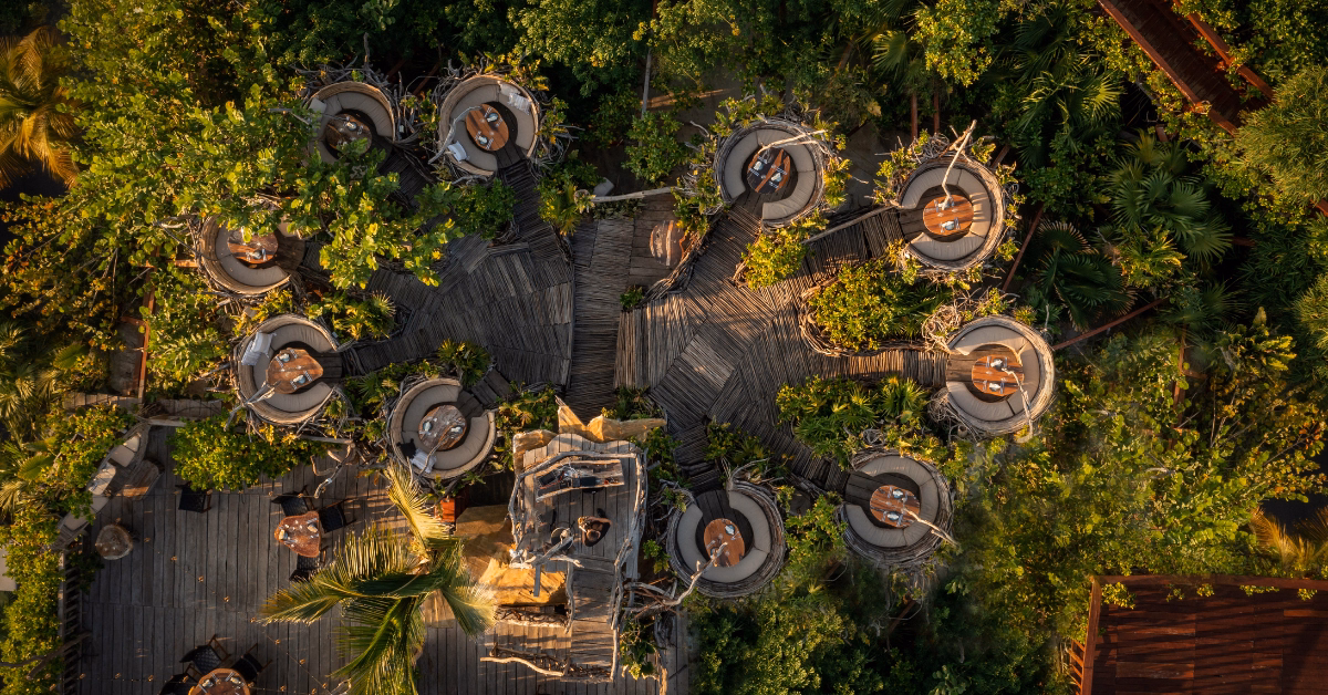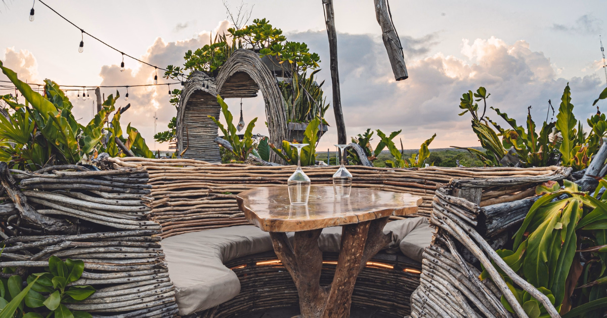 Karma is the rooftop restaurant at Kanan Hotel, with nest tables suspended above the hotel zone and views toward the ocean and jungle canopy.
