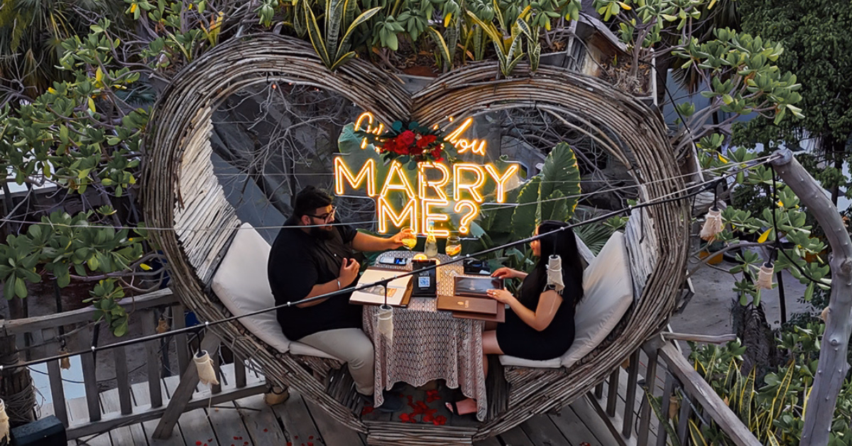 The concept sits between a dining destination and a sunset lounge — seafood and steakhouse menu, seating options that range from casual to romantic. The heart-shaped table is a popular pick for couples. It is the only rooftop near the beach that is kid-friendly.