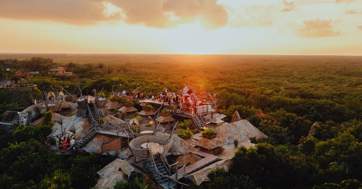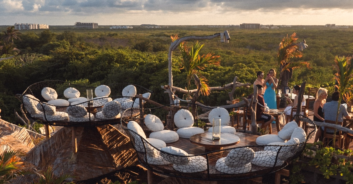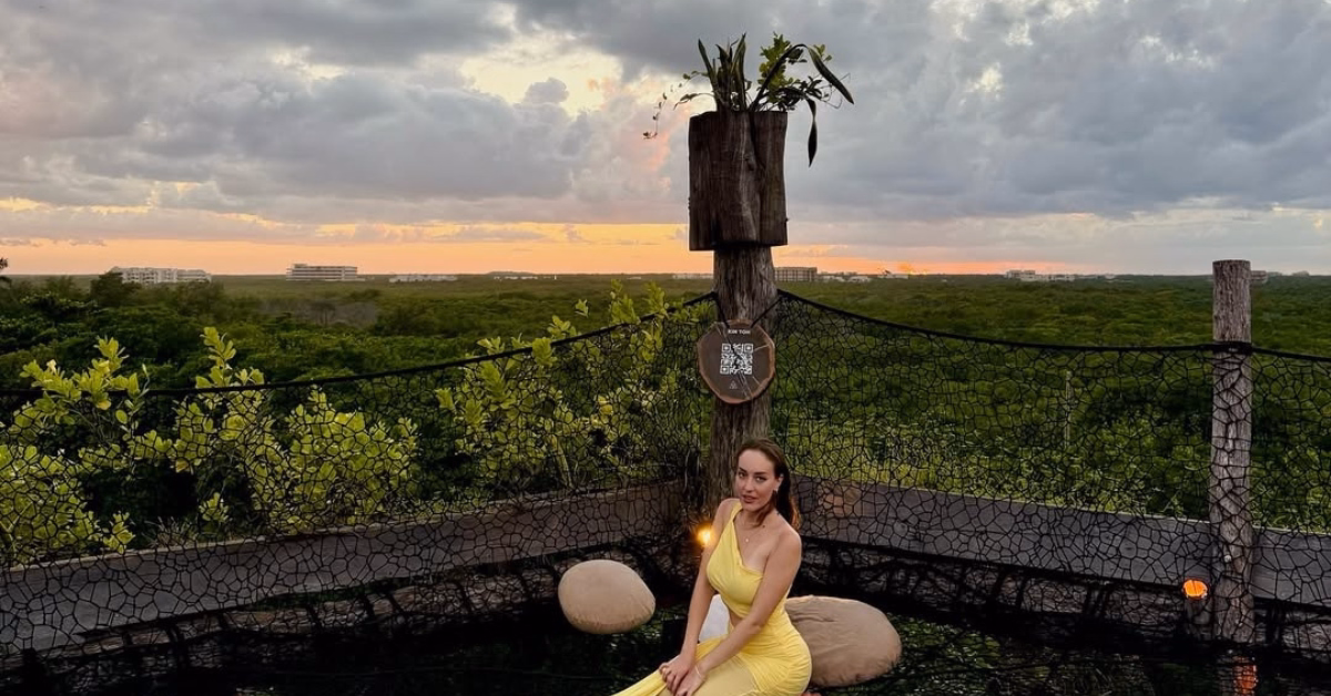It’s the kind of place that exists primarily as an architectural and sensory experience: elevated views over the Mayan jungle, no restaurant service, just the platform, the light, and the sound as the evening comes in. Heels and hard-soled shoes are not suited to the wooden structure — wear flat footwear.