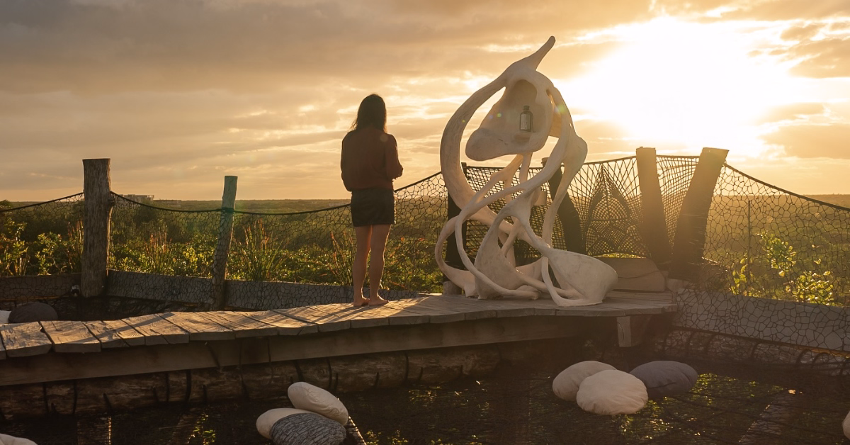 Mirador del Maestro is a sculptural observation platform within the Azulik property built entirely from organic materials and designed to frame the jungle canopy and sunset.