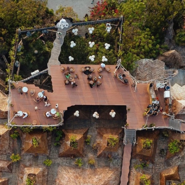 Aerial view of a mirador rooftop café surrounded by greenery and rustic structures, with several people sitting at tables on wooden decking. Winding pathways and varied architectural textures enhance the elevated scene.